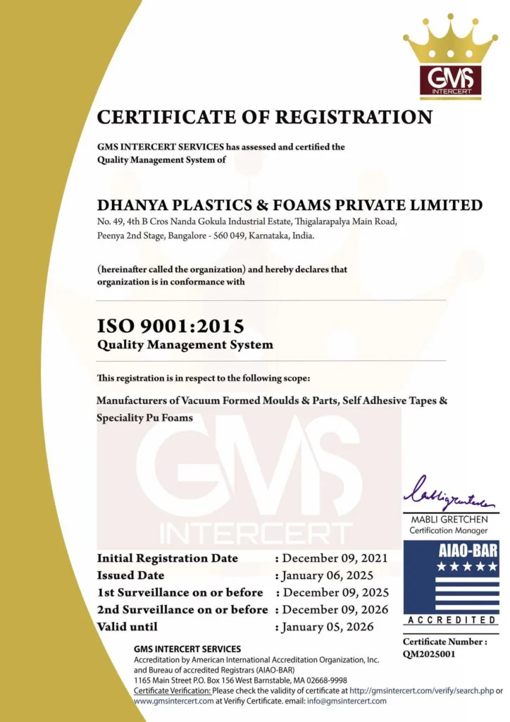 Dhanya Plastics and Foam Pvt Ltd believes in ensuring quality at source and therefore for every set of products. The QA team adopts specific validation processes, conducts performance checks along with the standard guidelines as per ISO 9001:2015 and other applicable standards. Active involvement in activities like CP,FMEA, FTA, SPC etc add value to the quality management processes thereby ensuring flawless production.